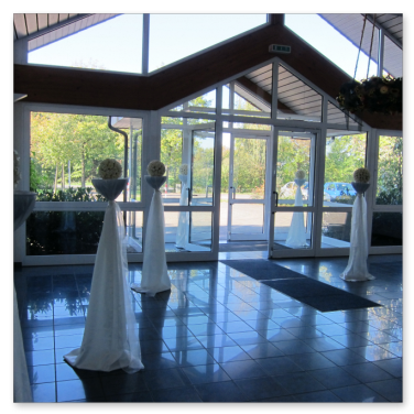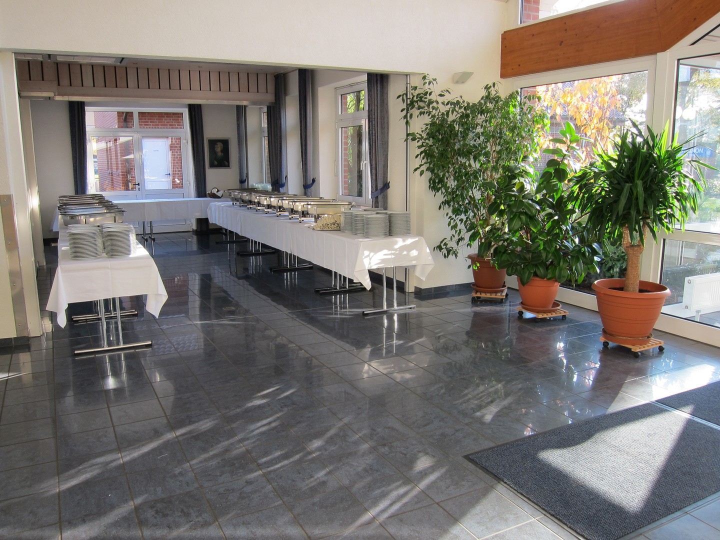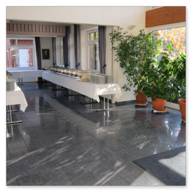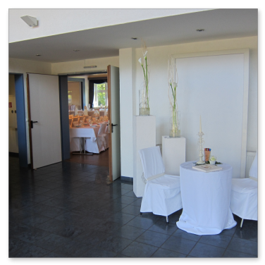 Man betritt das Bürgerhaus über ein großzügig dimensioniertes und lichtdurchflutetes Foyer. Dem Eingangsbereich ist rechts ein Raum angegliedert, welcher über eine verschiebbare Wand abgetrennt werden kann. Dieser Teilbereich kann für vielseitige Zwecke genutzt werden, so zum Beispiel für die Bereitstellung eines Buffets. Durch zwei Doppeltüren tritt man in das Zentrum des Bürgerhauses, den großen Saal.